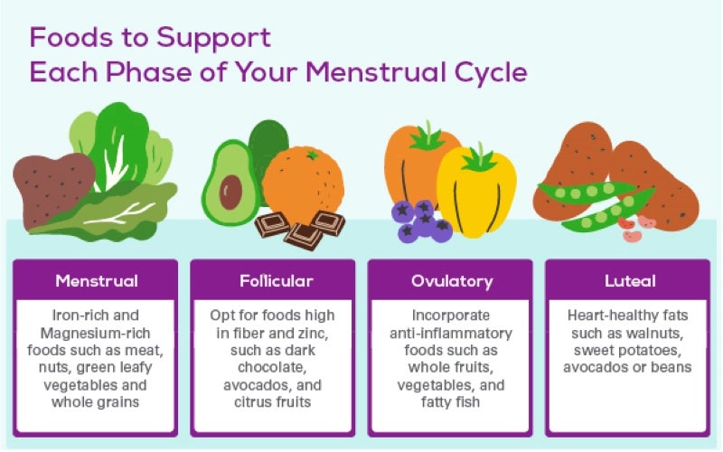 - Menstrual phase: Replace nutrients lost during your period by eating iron-rich foods like spinach, red meat, beans, and nuts. Pair these with foods high in vitamin C, like oranges or broccoli, to help absorb iron.