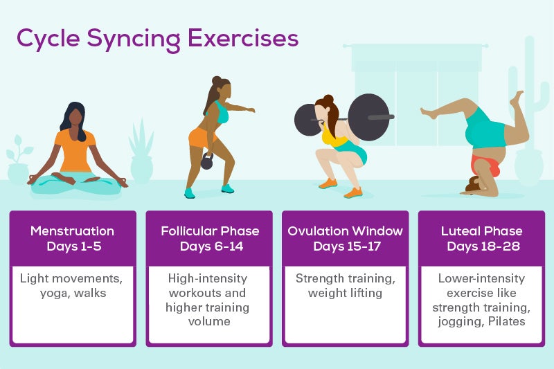 The best exercises for you will always depend on fitness level and individual needs. Listen to your body and try to change your workouts with your cycle to maximize your energy.