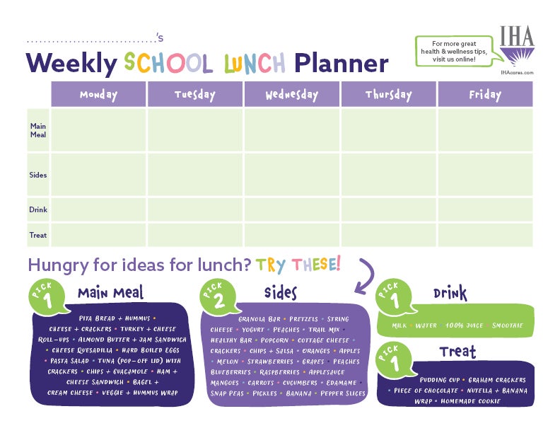 Create a weekly meal plan. Have your child help plan their lunches each week. The planning process will help understand healthy eating by including a variety of food groups as well as encourage your child to try new foods (fingers crossed!). Get your weekly school lunch planner template here.