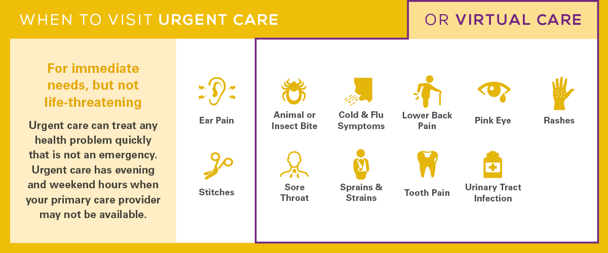 Visit the urgent care for minor illness or injury that’s not life-threatening occurring outside of your primary care provider’s regular hours.