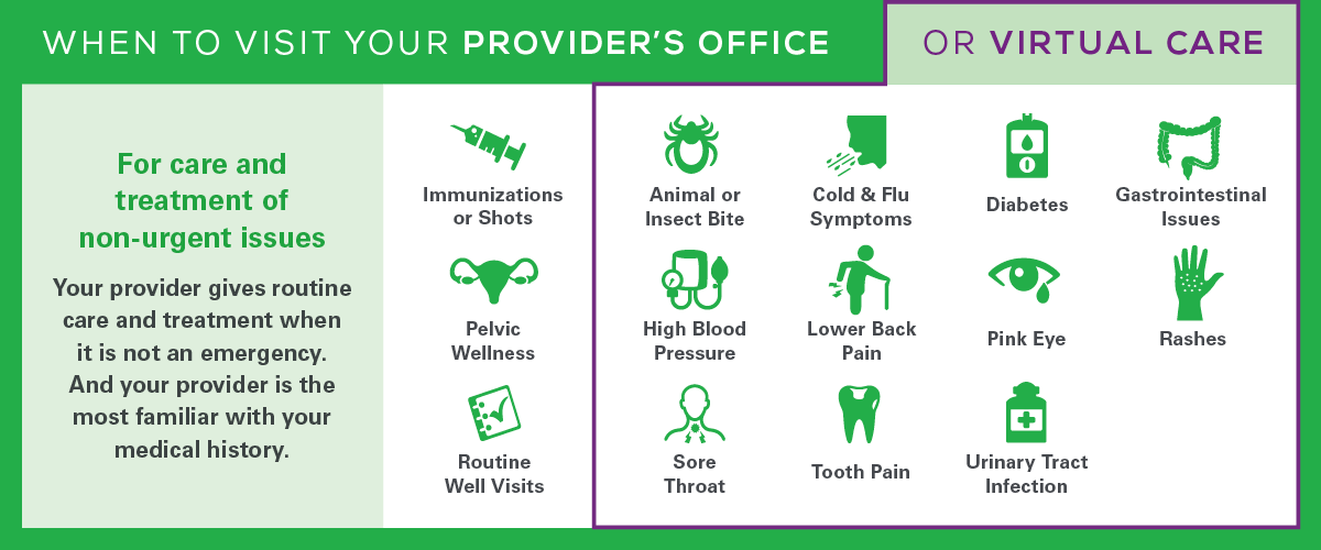 For all non-life-threatening emergencies, always call your primary care provider first. Your provider knows your history and can advise you when to use the other options for care.