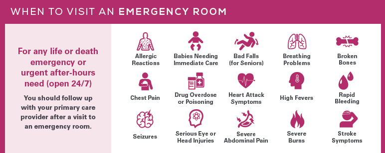 For all non-life-threatening emergencies, always call your primary care provider first. Your provider knows your history and can advise you when to use the other options for care.