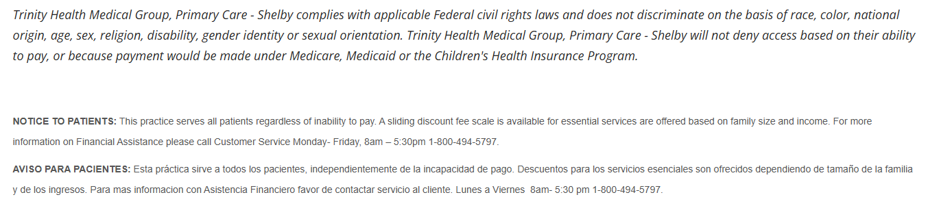 NOTICE TO PATIENTS: This practice serves all patients regardless of inability to pay. A sliding discount fee scale is available for essential services are offered based on family size and income. For more information on Financial Assistance please call Customer Service Monday- Friday, 8am – 5:30pm 1-800-494-5797.