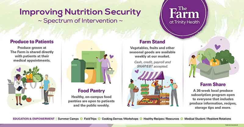 The Farm at Trinity Health provides community-centered food programs designed to improve health equity while investing in the local food system. The Farm is a part of a larger Trinity Health Food is Medicine initiative to address nutrition insecurity while improving health equity in our communities.